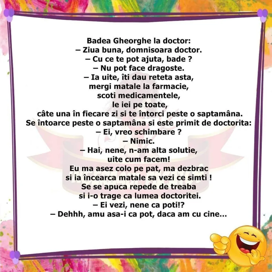 -Ia, uite, îți dau rețeta asta, mergi matale la farmacie, scoți medicamentele, le iei pe toate, câte una în fiecare zi și te întorci peste o săptămână.