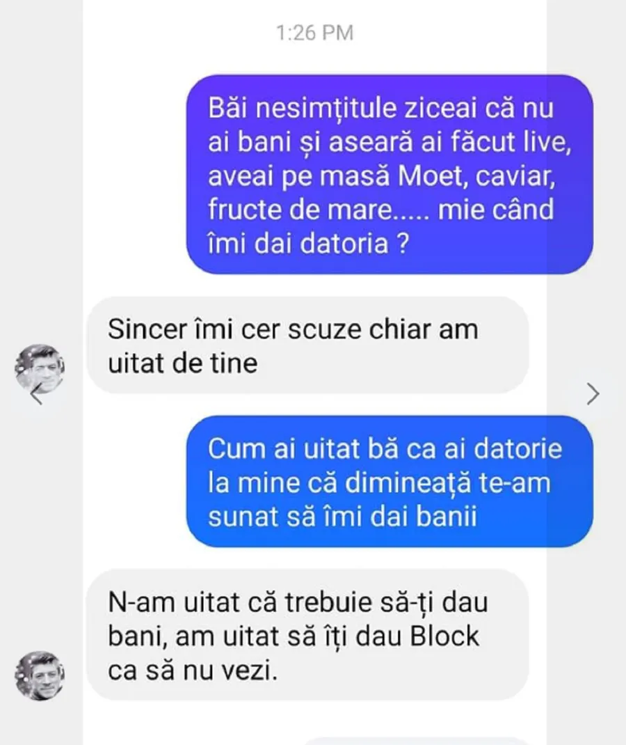 -Băi, nesimțitule, ziceai că nu ai bani și aseară ai făcut live, aveai pe masă Moet, caviar, fructe de mare… mie când îmi dai datoria?