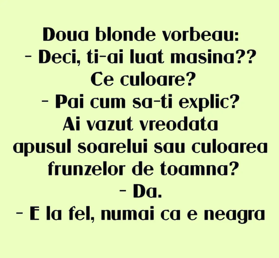 Dragă cititorule, CANCAN.RO ți-a pregătit un banc de nota 10. O blondă îi povestește unei alte blonde despre noua mașina pe care tocmai și-a cumpărat-o. Discuția dintre cele două te va amuza copios. Spor la râs și voie bună!