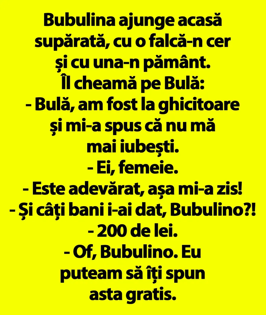 Nu ar trebui să treacă nici măcar o zi fără să zâmbești și fără să citești bancul zilei. CANCAN.RO ți-a pregătit un banc de nota 10. Bubulina a mers la ghicitoare și a aflat că Bulă nu o iubește. Ajunge acasă supărată, cu o falcă-n cer și una-n pământ și îl trage la răspundere pe Bulă. Ce a urmat e demn de cele mai haioase scenarii. Spor la râs!