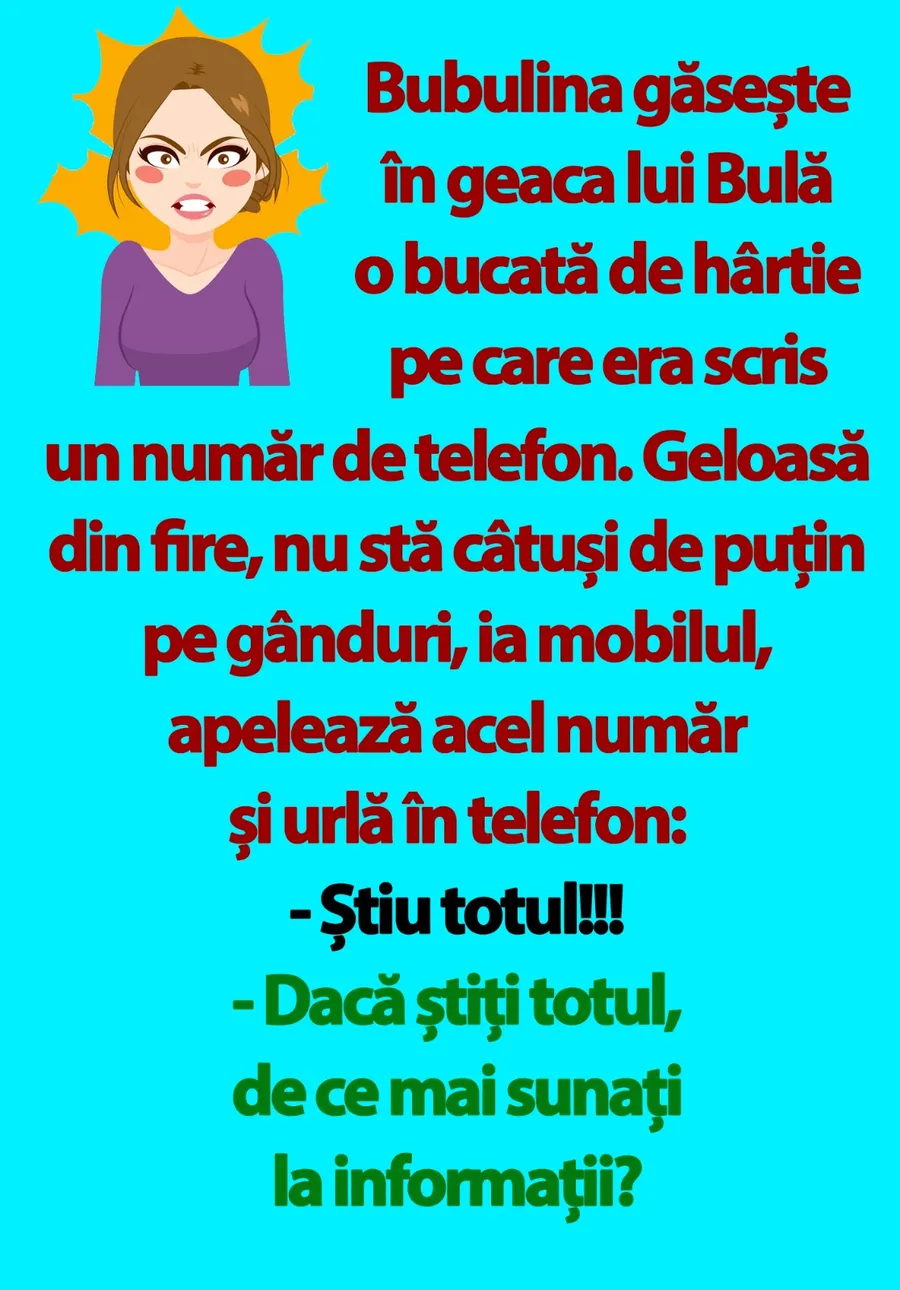 Dragă cititorule, CANCAN.RO ți-a pregătit un banc de nota 10. Bubulina găsește în geaca lui Bulă o bucată de hârtie pe care era scris un număr de telefon. Ce a urmat te va face să râzi cu gura până la urechi. Spor și voie bună!