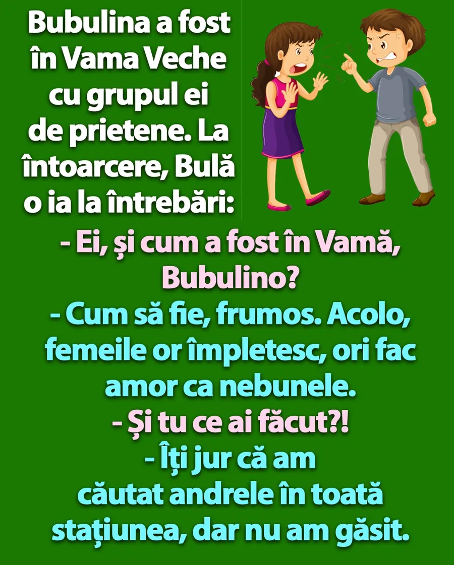 Dragi cititori, CANCAN.RO vă pune la dispoziție o discuție amuzantă dintre Bulă și Bubulina, cu care să vă începeți ziua bine. Ce mărturisire a făcut Bubulina, după ce Bulă a întrebat-o cum s-a distrat în Vama Veche? Vei râde în hohote!