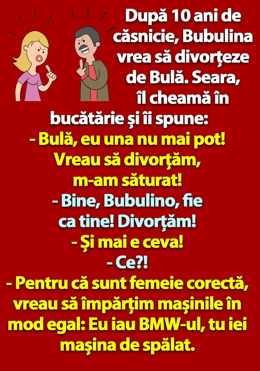 – Bulă, eu una nu mai pot! Vrea să divorțăm, m-am săturat!