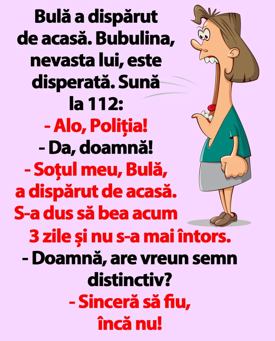 – Soțul meu, Bulă, a dispărut de acasă. S-a dus să bea acum 3 zile și nu s-a mai întors.