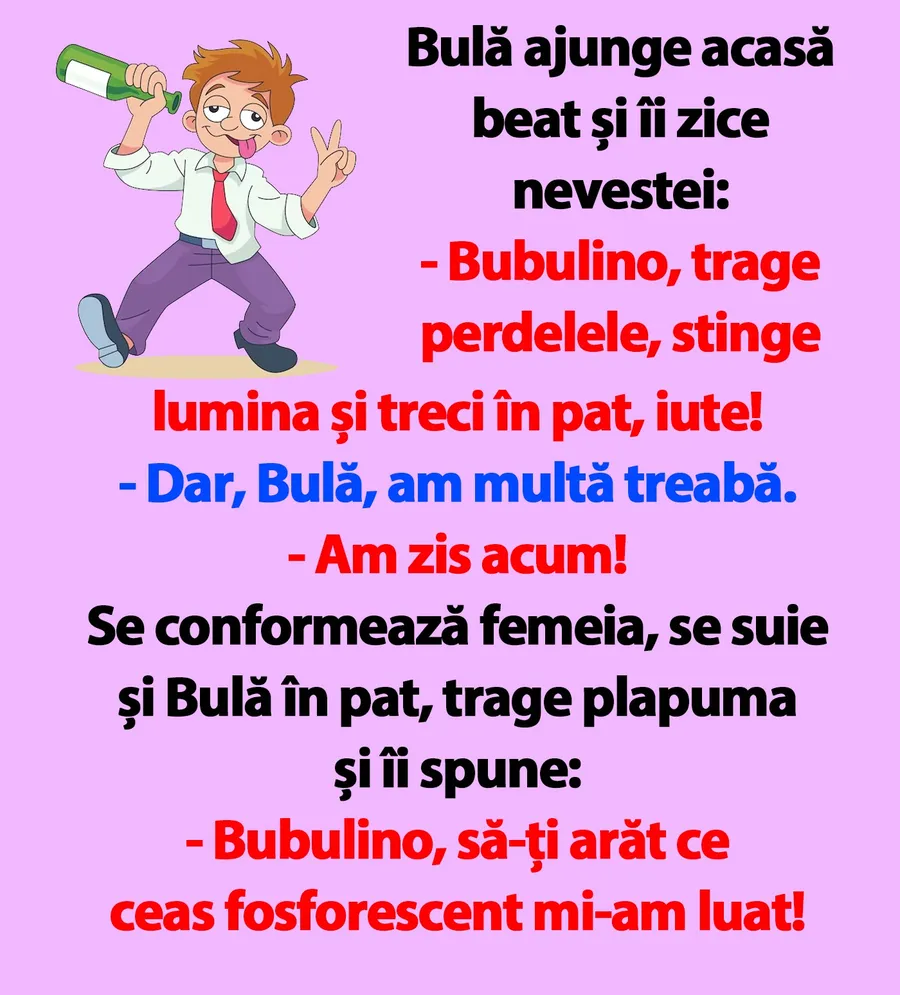 BANC | Bulă ajunge acasă beat și îi zice nevestei: „Bubulino, trage perdelele și treci în pat, iute!”