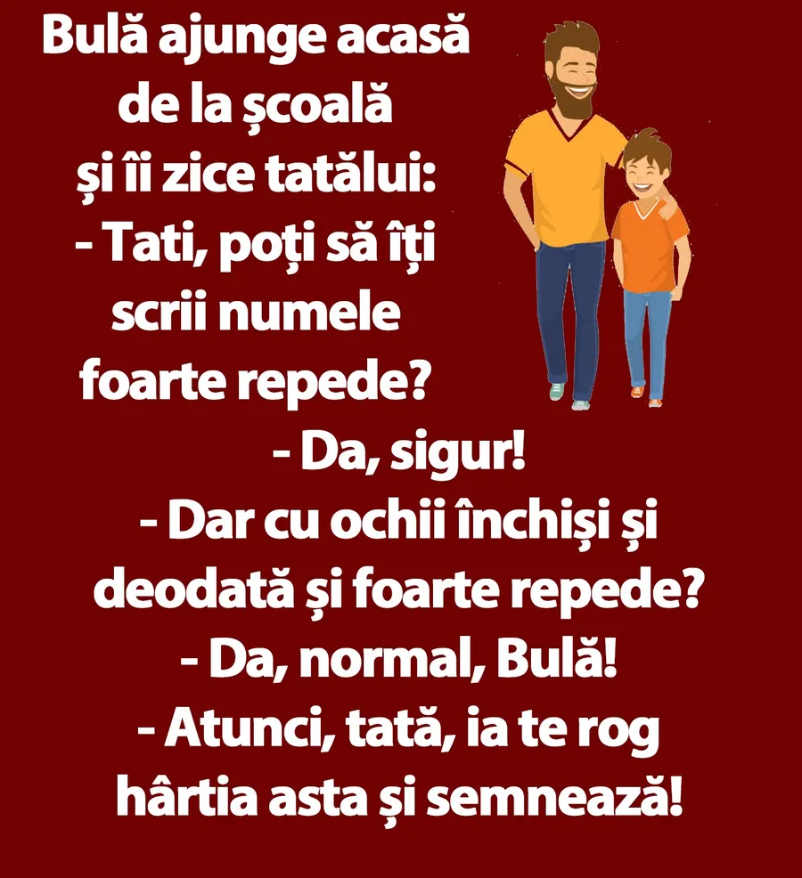 BANC | Bulă ajunge acasă de la școală și îi zice tatălui: „Poți să îți scrii numele foarte repede?”