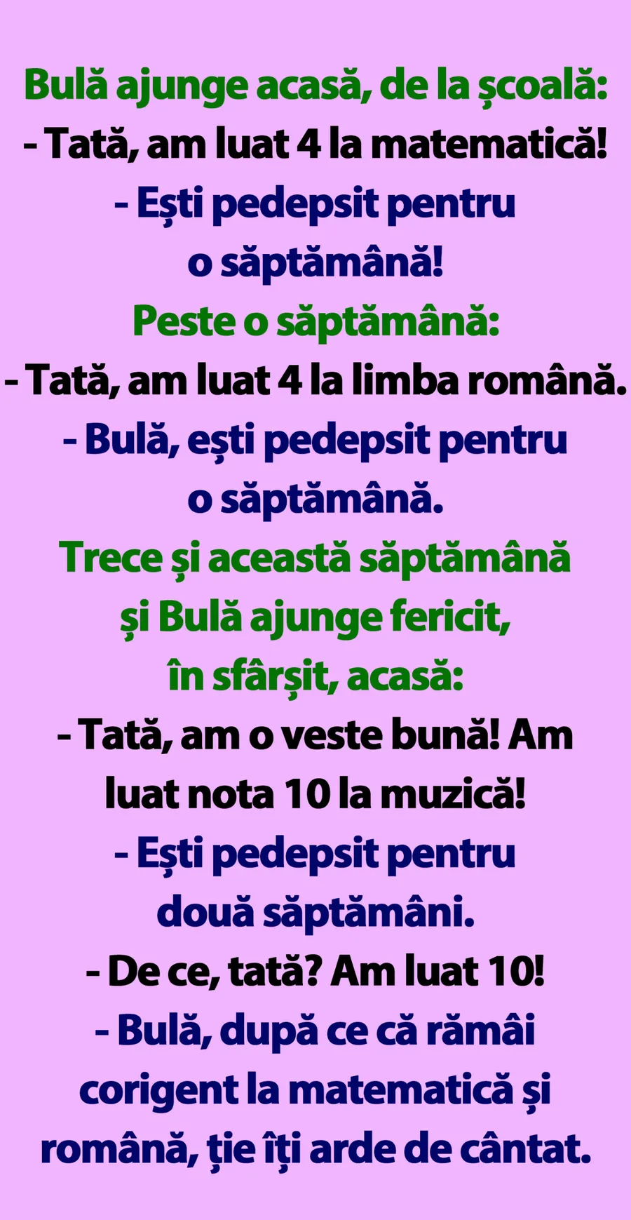 – Bulă, după ce că rămâi corigent la matematică și română, ție îți arde de cântat.
