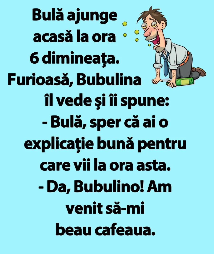 Banc. Este duminică dimineața, motiv pentru care este momentul să zâmbiți! În a doua zi de weekend, vă aducem un nou banc savuros cu celebrul Bulă. Ajunge Bulă acasă, la șase dimineața, și dă nas în nas cu Bubulina, soția lui! Scurtul dialog între cei doi stârnește amuzamentul. Spor la râs.
