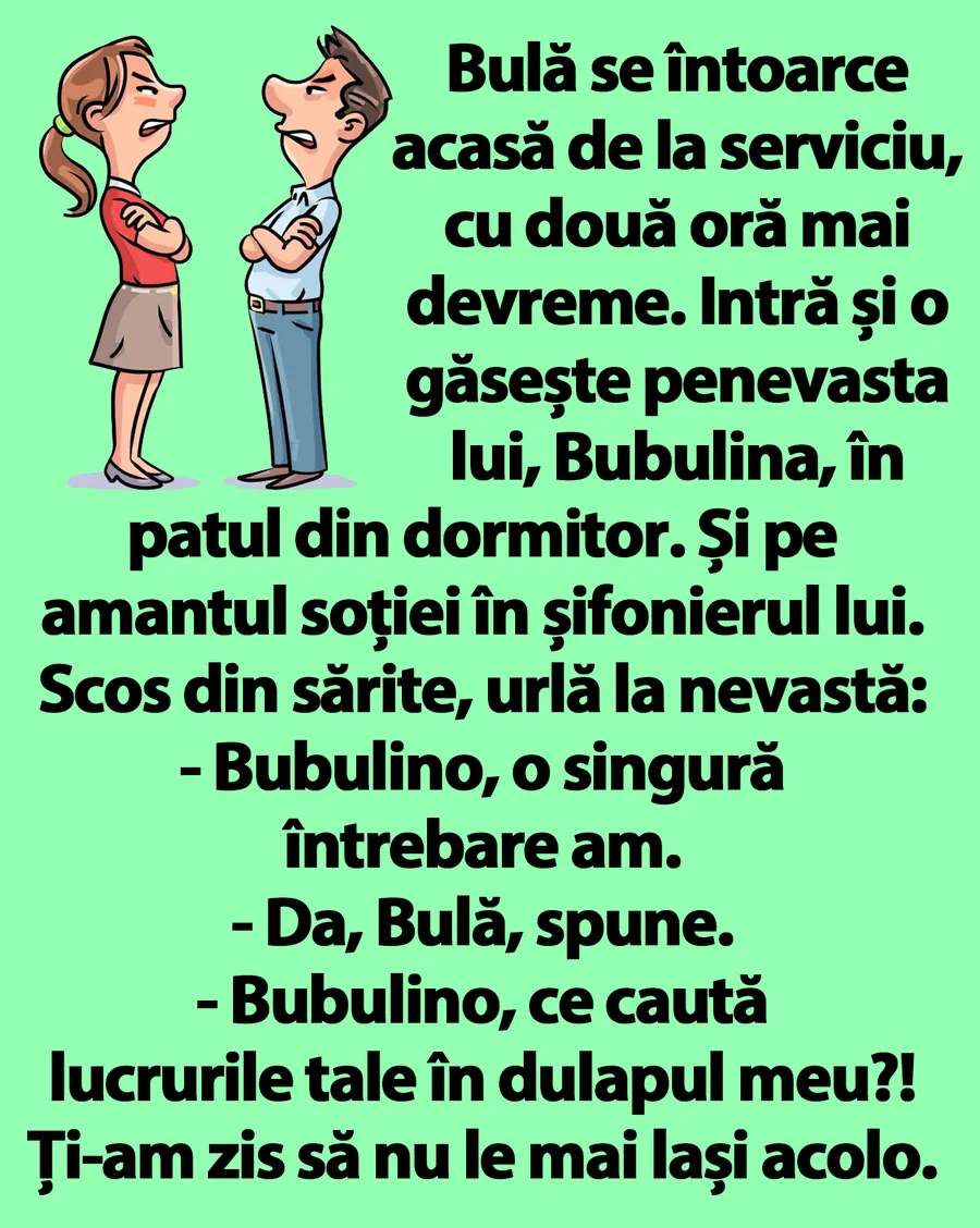 Ziua bună se cunoaște încă de dimineață, așa că trebuie începută cu zâmbetul pe buze. Iar pentru asta am pregătit un banc care cu siguranță te va amuza copios. Protagoniștii de astăzi sunt Bulă și Bubulina. Ea este infidelă, iar el o prinde în fapt. Deznodământul este hilar.