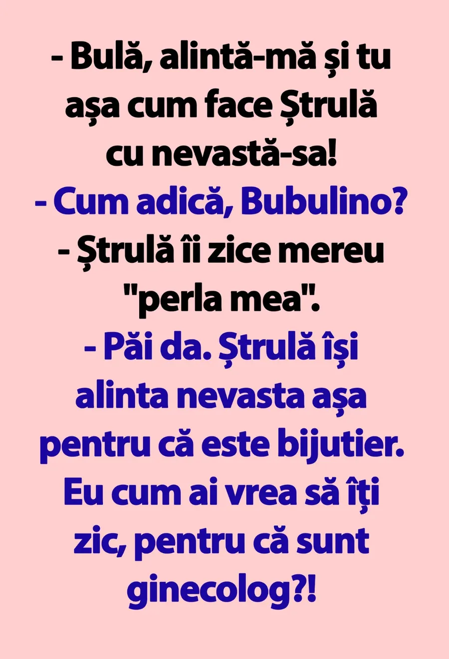 – Păi da. Ștrulă își alintă nevasta așa pentru că este bijutier. Eu cum ai vrea să îți zic, pentru că sunt ginecolog?!