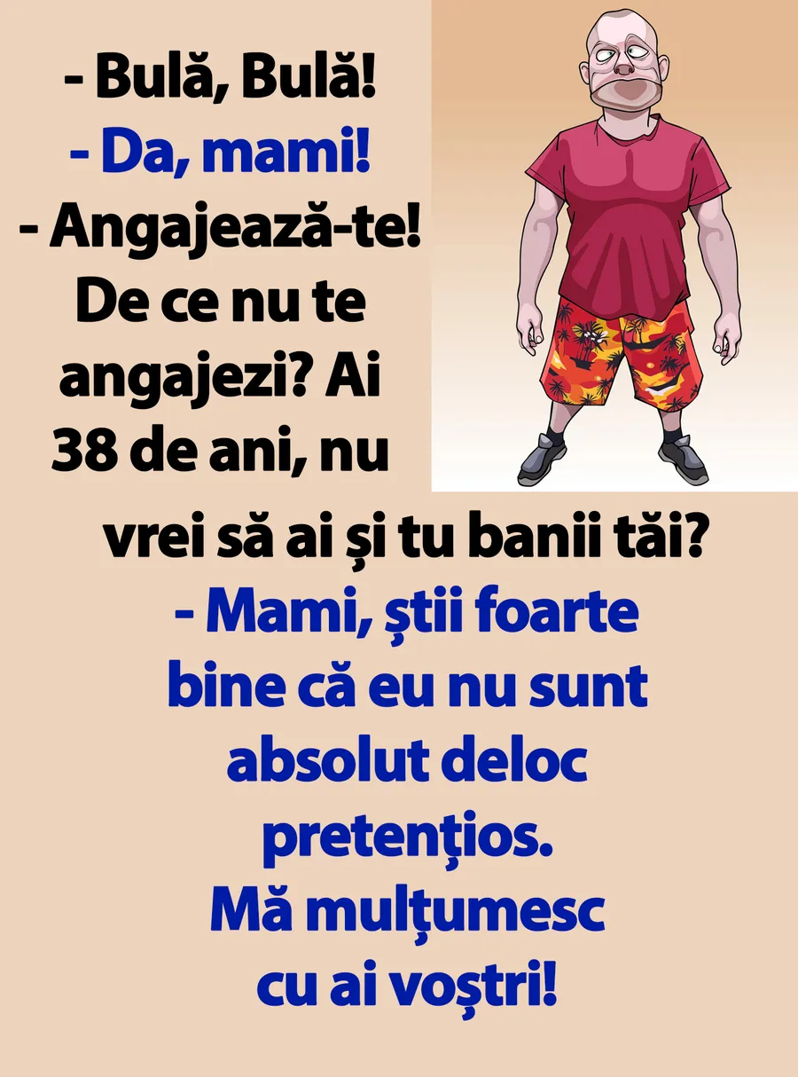 Dragi cititori, CANCAN.RO vrea să vă aducă zâmbetul pe buze, așa că vă pune la dispoziție un banc amuzant. Conversația hilară dintre Bulă și mama lui, care-l trimite să se angajeze. Vei râde cu lacrimi!