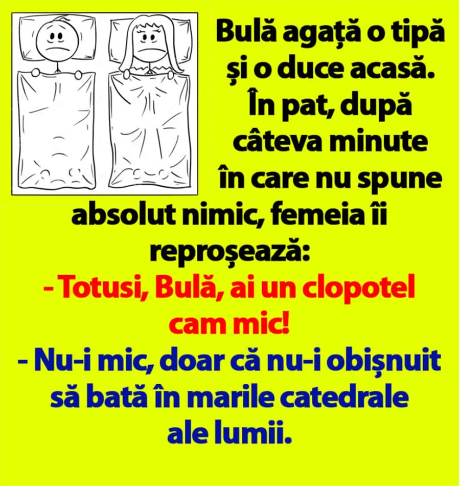 Dragi cititori, pentru o zi de sâmbătă perfectă, plină de râsete și voie bună, CANCAN.RO vă prezintă un banc amuzant cu Bulă. Merge în club și agață o tipă, apoi o invită la el acasă. Ce se întâmplă după ce trec la fapte „mari”? Vei râde cu lacrimi!