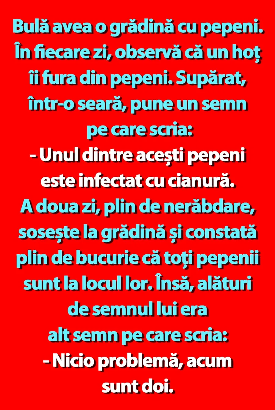 Bulă avea o grădină cu pepeni. În fiecare zi, observă că un hoț îi fura din pepeni. Supărat, într-o seară, pune un semn pe care scria: