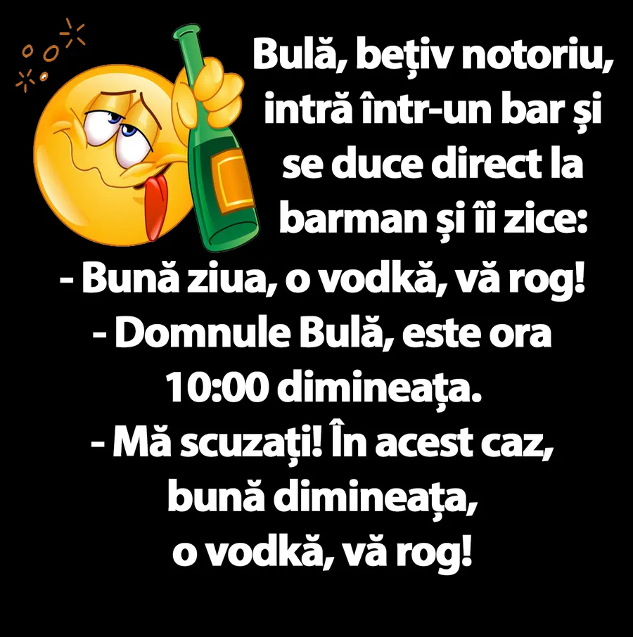 BANC | Bulă, bețiv notoriu, intră într-un bar: „Bună ziua, o vodkă, vă rog!”