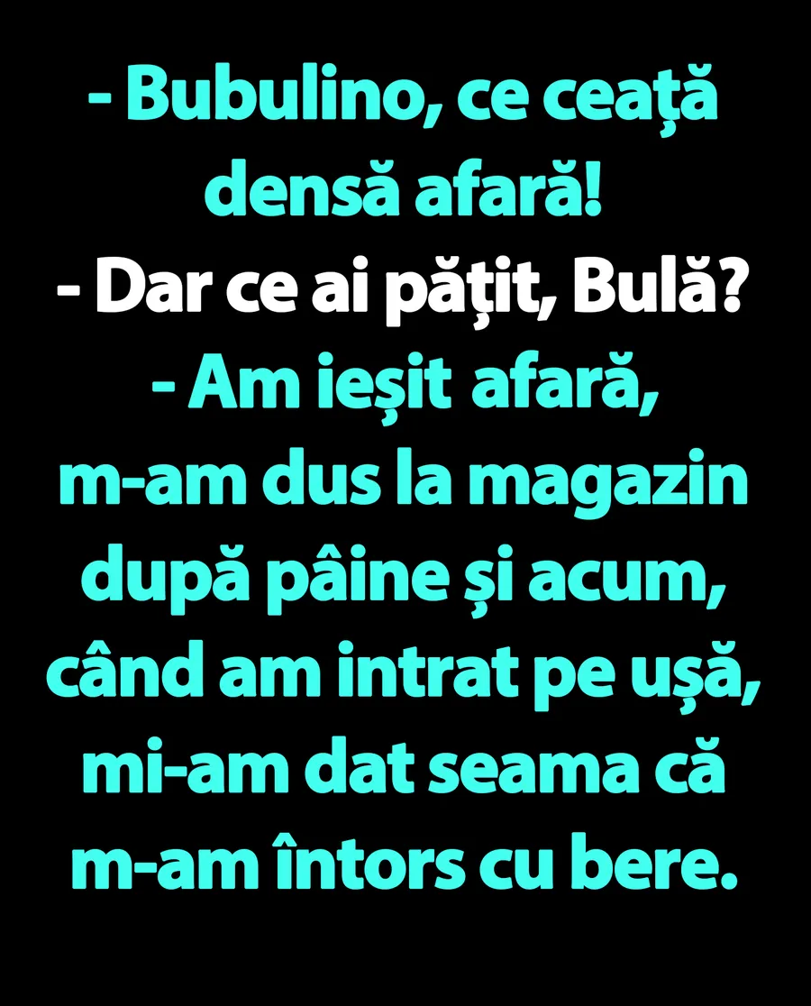 Dragi cititori, echipa CANCAN.ro vă aduce, în această zi de vineri, bancul zilei. Protagonistul este celebrul nostru personaj Bulă, iubita lui, Bubulina, și ceața densă care pare să persiste și în România, dar și în Balcani! Hai să râdem împreună în rândurile următoare!