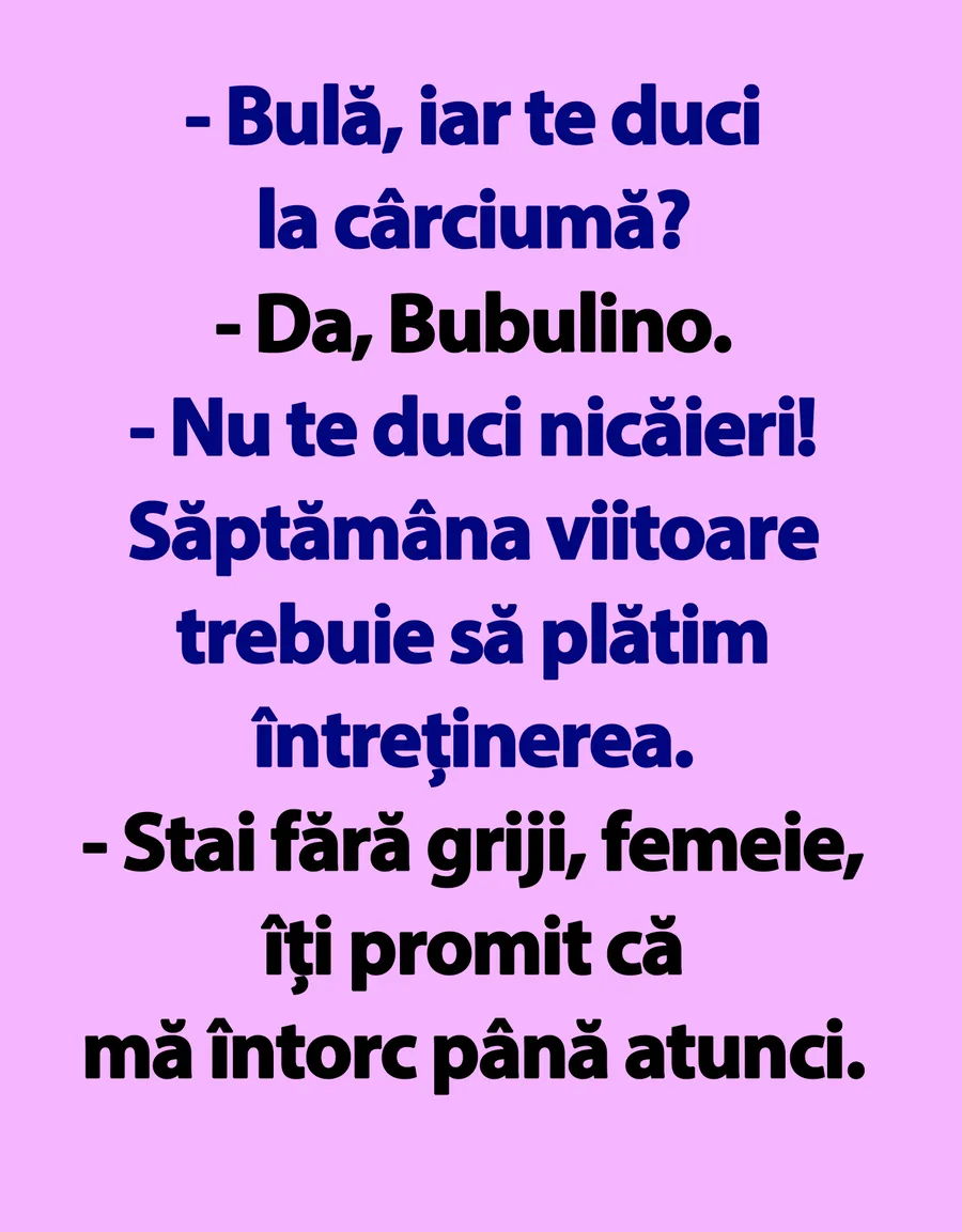 Ziua de relaxare se cunoaște de la prima oră și echipa CANCAN.ro vă aduce un banc bun, menit să vă facă să râdeți. Azi ne bucurăm de un dialog savuros între celebrul Bulă și jumătatea lui, Bubulina. Motivul discuției? Celebra întreținere de la bloc!