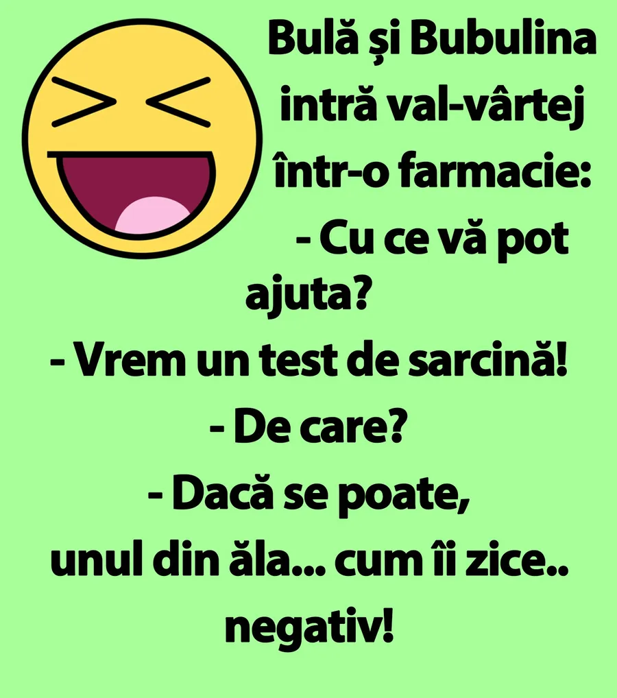Dragă cititorule, CANCAN.RO îți înveselește ziua cu un banc de nota 10. Bulă și Bubulina intră într-o farmacie și vor să cumpere un test de sarcină. Ești pregătit să râzi cum nu ai mai făcut-o de mult timp? Spor și voie bună!