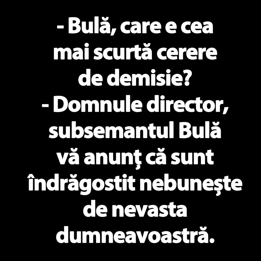 – Domnule director, subsemnatul Bulă vă anunț că sunt îndrăgostit nebunește de nevasta dumneavoastră.