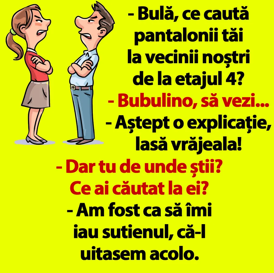 „- Bulă, ce caută pantalonii tăi la vecinii noștri de la etajul 4?