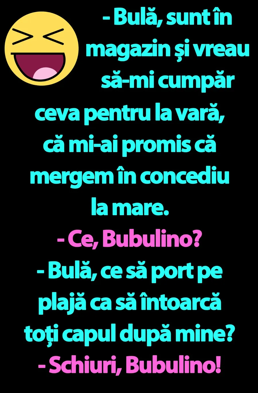 – Bulă, sunt în magazin și vreau să-mi cumpăr ceva pentru la vară, că mi-ai promis că mergem în concediu la mare.