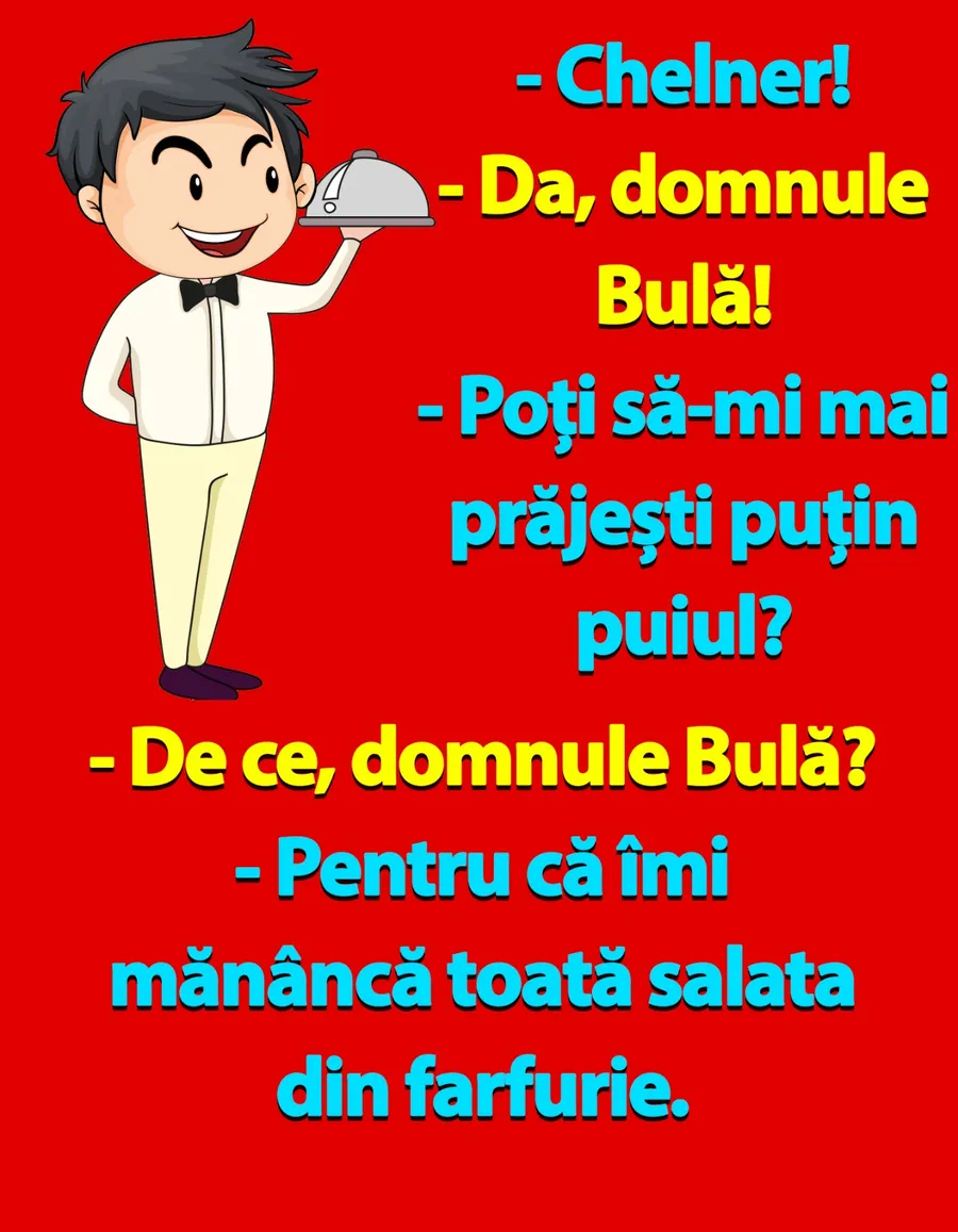 Dragi cititori, CANCAN.RO vrea să vă aducă zâmbetul pe buze, așa că vă pune la dispoziție un banc amuzant. Discuția hilară dintre Bulă și un chelner, la scurt timp după ce ajunge la restaurant. Îi dă comanda, apoi așteaptă liniștit la masă, însă are parte de o surpriză. Vei râde cu lacrimi!