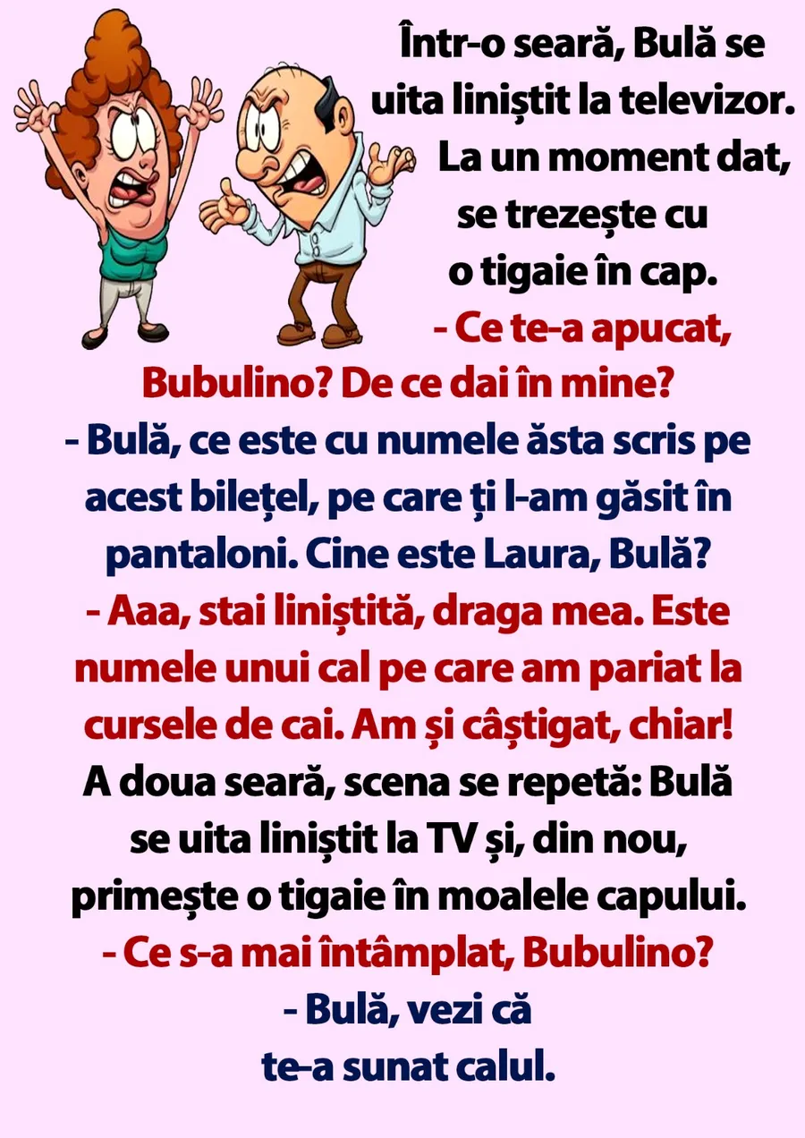 Dragă cititorule, CANCAN.RO ți-a pregătit un banc de nota 10. Într-o seară, Bulă se uita liniștit la televizor. La un moment dat, se trezește cu o tigaie în cap de la Bubulina. Spor la râs și voie bună.