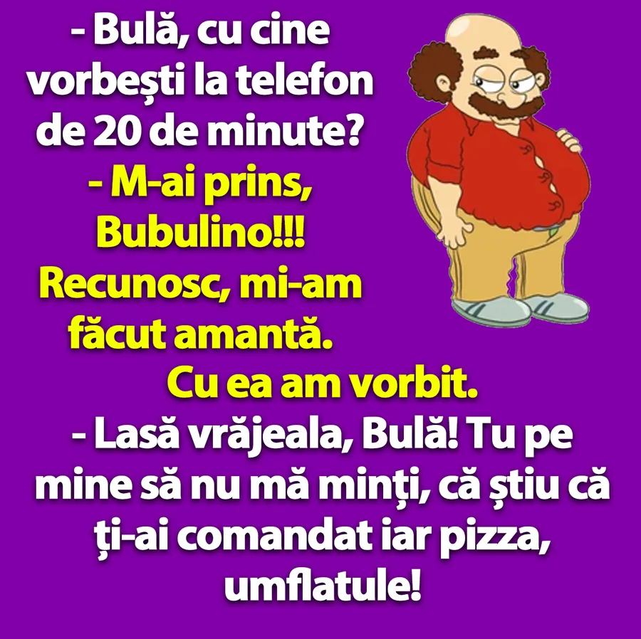 – Lasă vrăjeala, Bulă! Tu pe mine să nu mă minți, că știu că ți-ai comandat iar pizza, umflatule!”