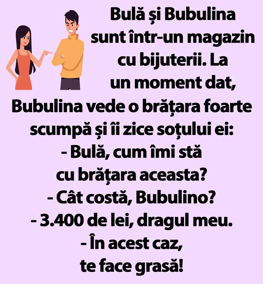Banc. Este luni dimineața, motiv pentru care este momentul să vă începeți săptămâna cu zâmbetul pe buze. Bulă stă de vorbă cu Bubulina, într-un magazin de bijuterii. La un moment dat, partenera lui îl întreabă dacă îi stă bine cu o brățară pe care și-a ales-o. Reacția lui Bulă stârnește amuzamentul. Spor la râs!