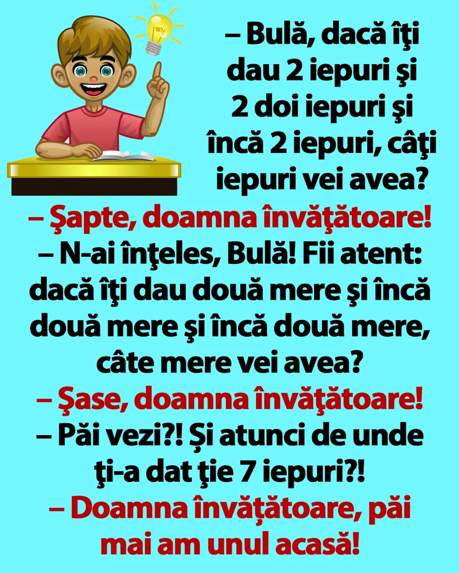 – Păi vezi?! Și atunci de unde ţi-a dat ţie 7 iepuri?!