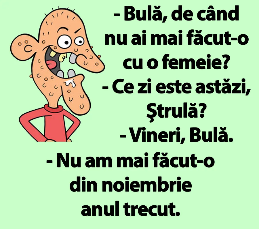 Banc. Este luni dimineața, motiv pentru care vă readucem zâmbetul pe buze. Bulă și Ștrulă stau de vorbă. Bulă este întrebat de cât timp nu a mai avut „acțiune” în pat. Răspunsul stârnește amuzamentul! Spor la râs, dragi cititori!