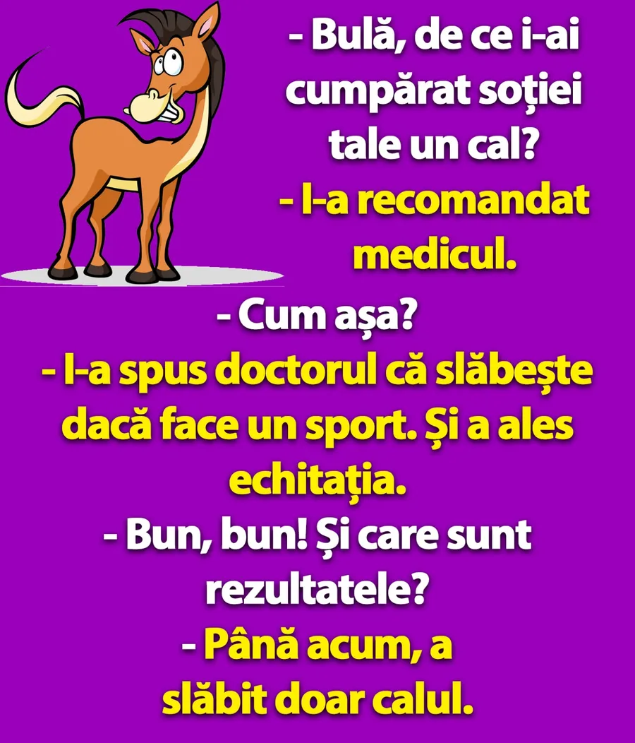 Banc. Este începutul unei noi săptămâni, motiv pentru care vă aducem în atenție noi bancuri, pentru a zâmbi. De data aceasta, avem în prim-plan un banc cu Bulă. I-a cumpărat soției sale un cal, la recomandarea medicului. Întrebat care a fost, de fapt, motivul real al acestei achiziții, Bulă a uimit cu răspunsul său. Dialogul stârnește amuzament. Spor la râs, dragi cititori!