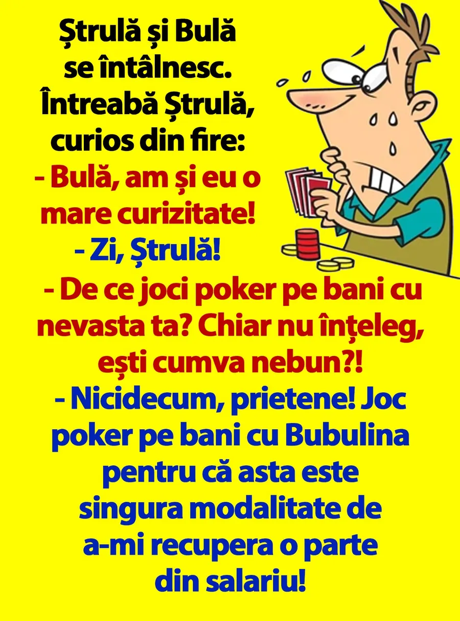Ziua trebuie începută cu zâmbetul pe buze, așa că am pregătit un banc care cu siguranță te va amuza copios. Protagoniștii de astăzi sunt Ștrulă și Bulă. Ștrulă vrea să afle de ce Bulă joacă poker pe bani cu soția sa, iar răspunsul acestuia este hilar.