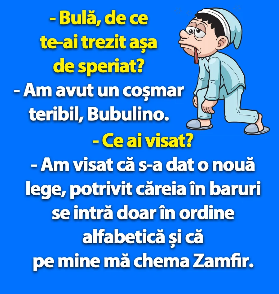 – Am visat că s-a dat o nouă lege, potrivit căreia în baruri se intră doar în ordine alfabetică și că pe mine mă chema Zamfir.