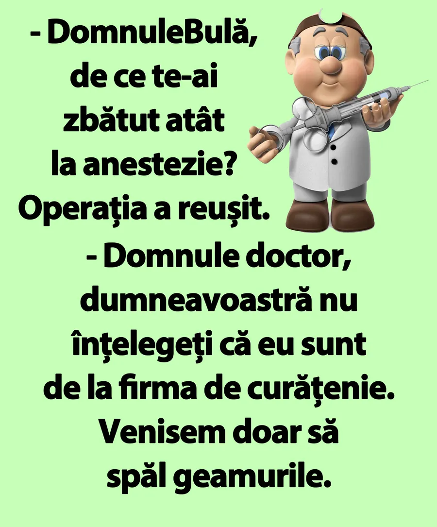 – Domnule Bulă, de ce te-ai zbătut atât la anestezie? Operația a reușit.
