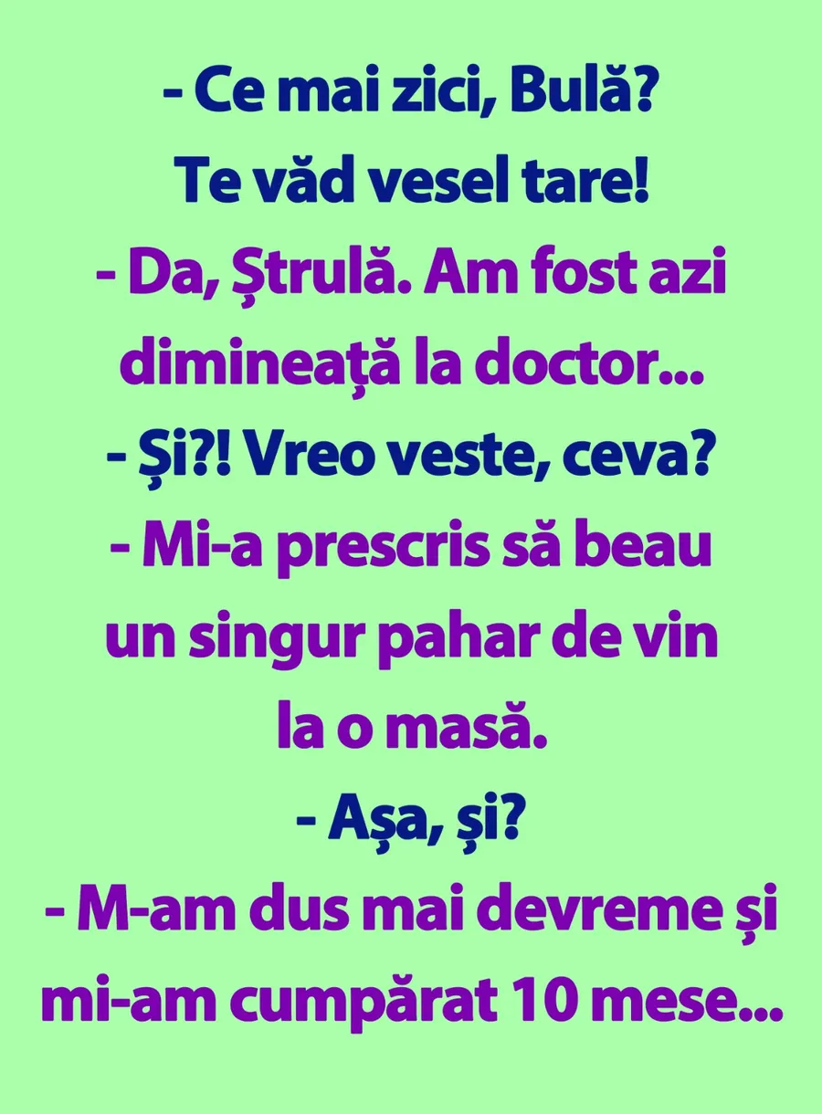– Mi-a prescris să beau un singur pahar de vin la o masă.
