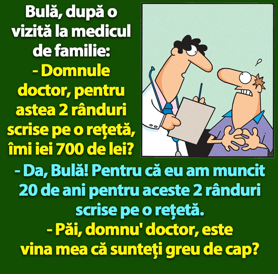 – Domnule doctor, pentru astea 2 rânduri scrise pe o rețetă, îmi iei 700 de lei?