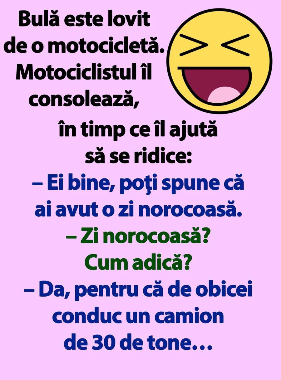 Dragi cititori, CANCAN.RO vă prezintă un banc savuros, în acest sfârșit de săptămână, cu Bulă, personajul preferat al românilor. Așadar, luați-vă câteva momente și bucurați-vă de această glumă pentru a începe ziua într-o notă pozitivă. Spor la râs și voie bună!