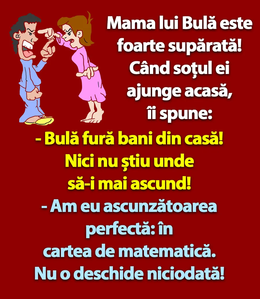 Banc. Este luni dimineață, moment perfect în care să vă aducem zâmbetul pe buze, pentru ca ziua să vă meargă bine! De data aceasta, vă prezentăm un banc savuros cu Bulă. Mama lui poartă o discuție cu tatăl, spunându-i acestuia că fiul lor, Bulă, fură bani din casă. Dar tatăl vine cu o soluție optimă: să îi ascundă într-un loc în care fiul lor nu ar căuta niciodată! Spor la râs, dragi cititori!
