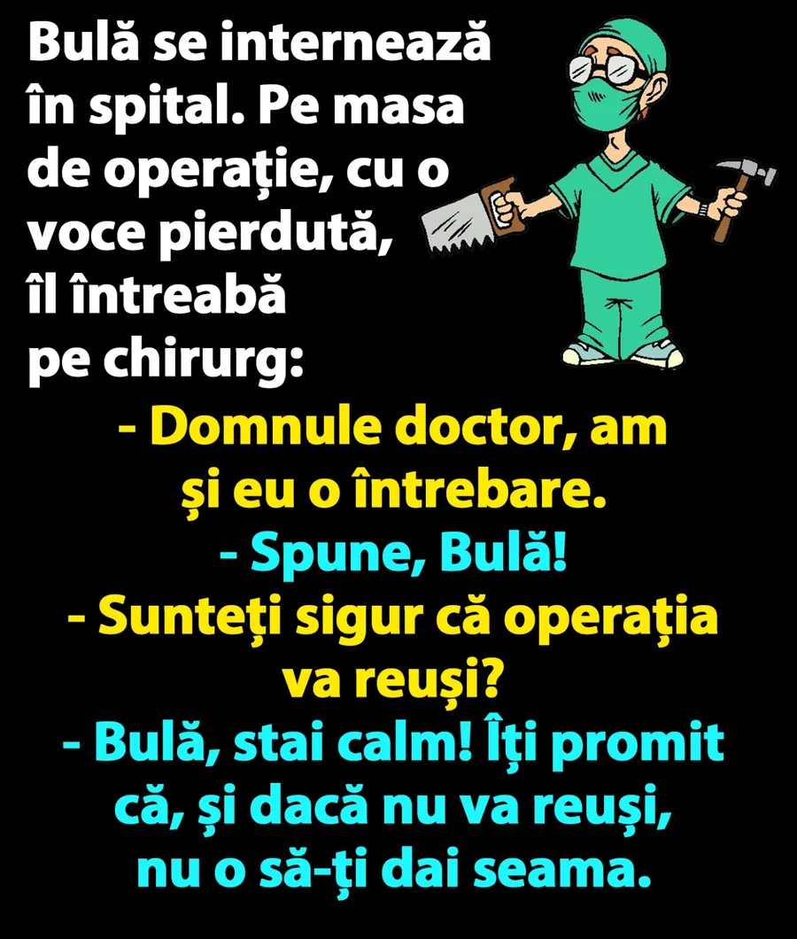 Bulă se internează în spital. Pe masa de operație, cu o voce pierdută, îl întreabă pe chirurg: