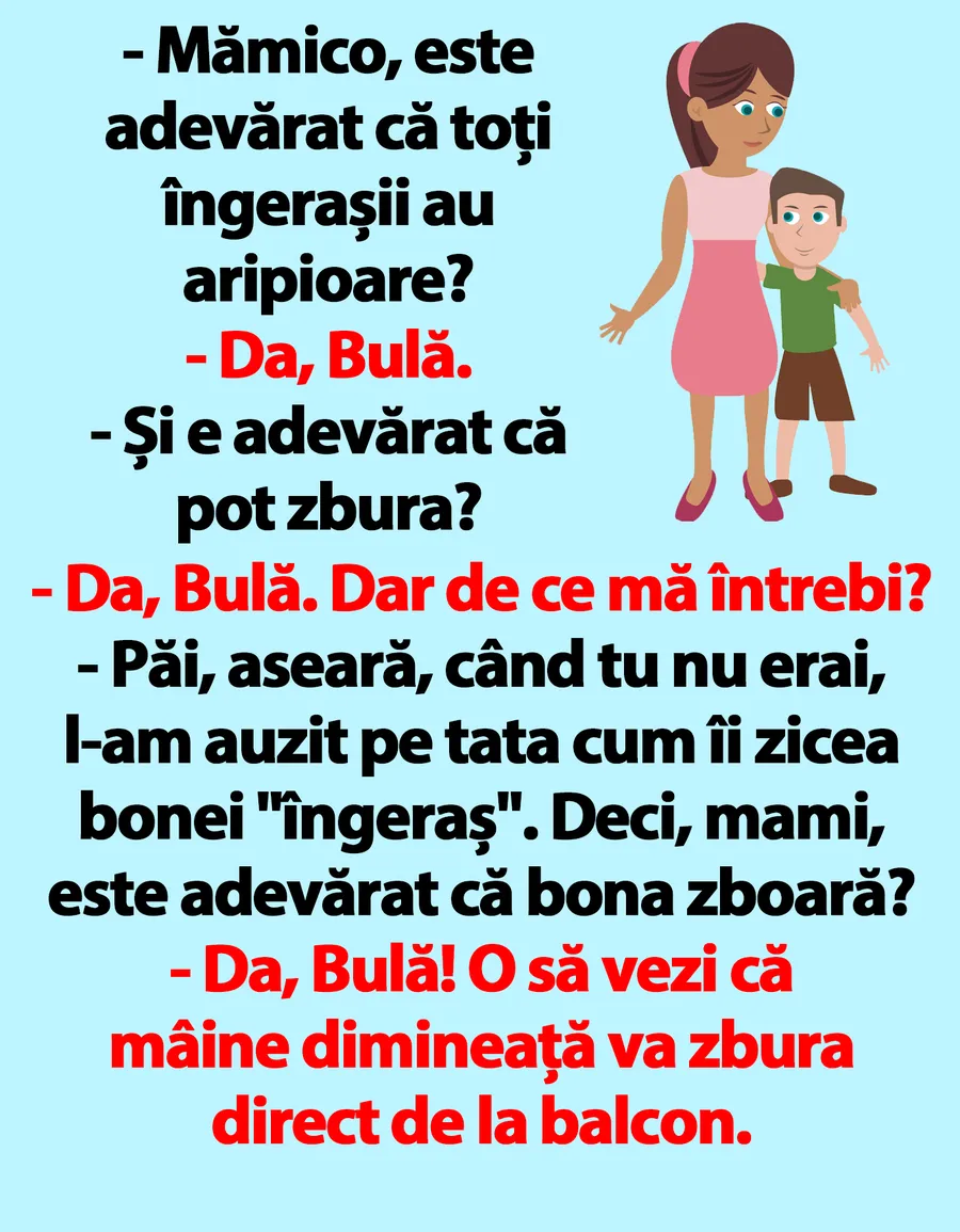 – Păi, aseară, când tu nu erai, l-am auzit pe tata cum îi zicea bonei „îngeraș”. Deci, mami, este adevărat că bona zboară?