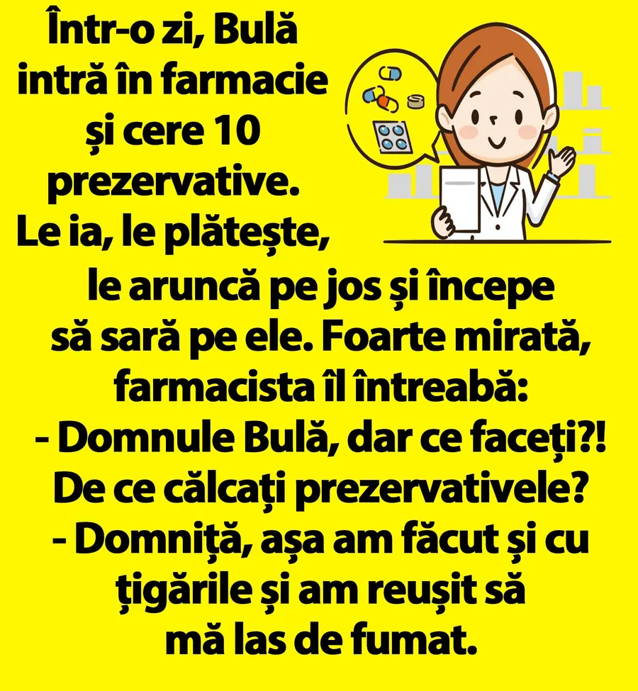 „Într-o zi, Bulă intră în farmacie și cere 10 prezervative. Le ia, le plătește, le aruncă pe jos și începe să sară pe ele. Foarte mirată, farmacista îl întreabă: