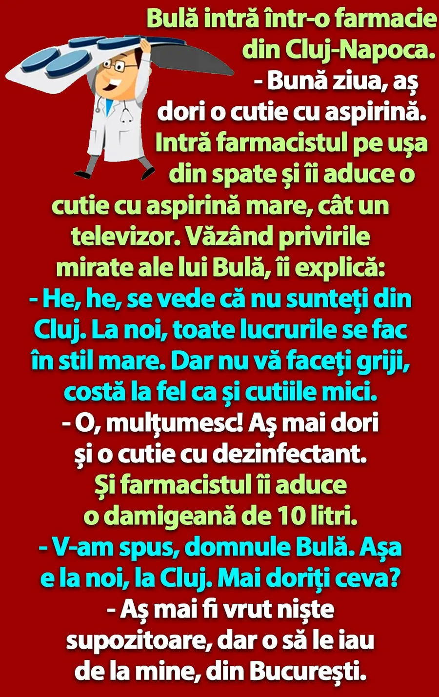 Bulă te va face mereu să râzi cu poftă, tocmai de aceea, CANCAN.RO ți-a pregătit un banc nou pentru astăzi. Iată cum decurge o discuție între personajul principal și un farmacist din Cluj-Napoca.