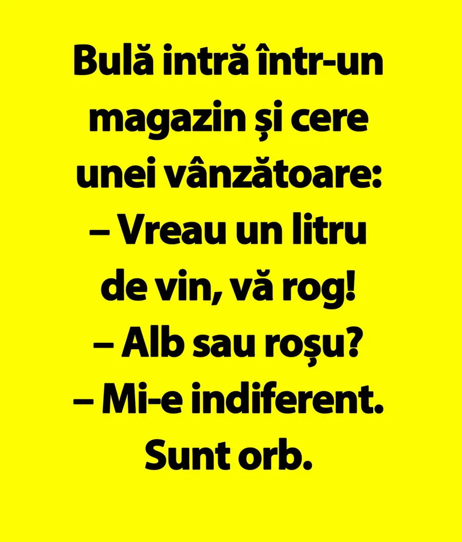 BANC | Bulă intră într-un magazin și cere vânzătoarei: „Vreau un litru de vin”