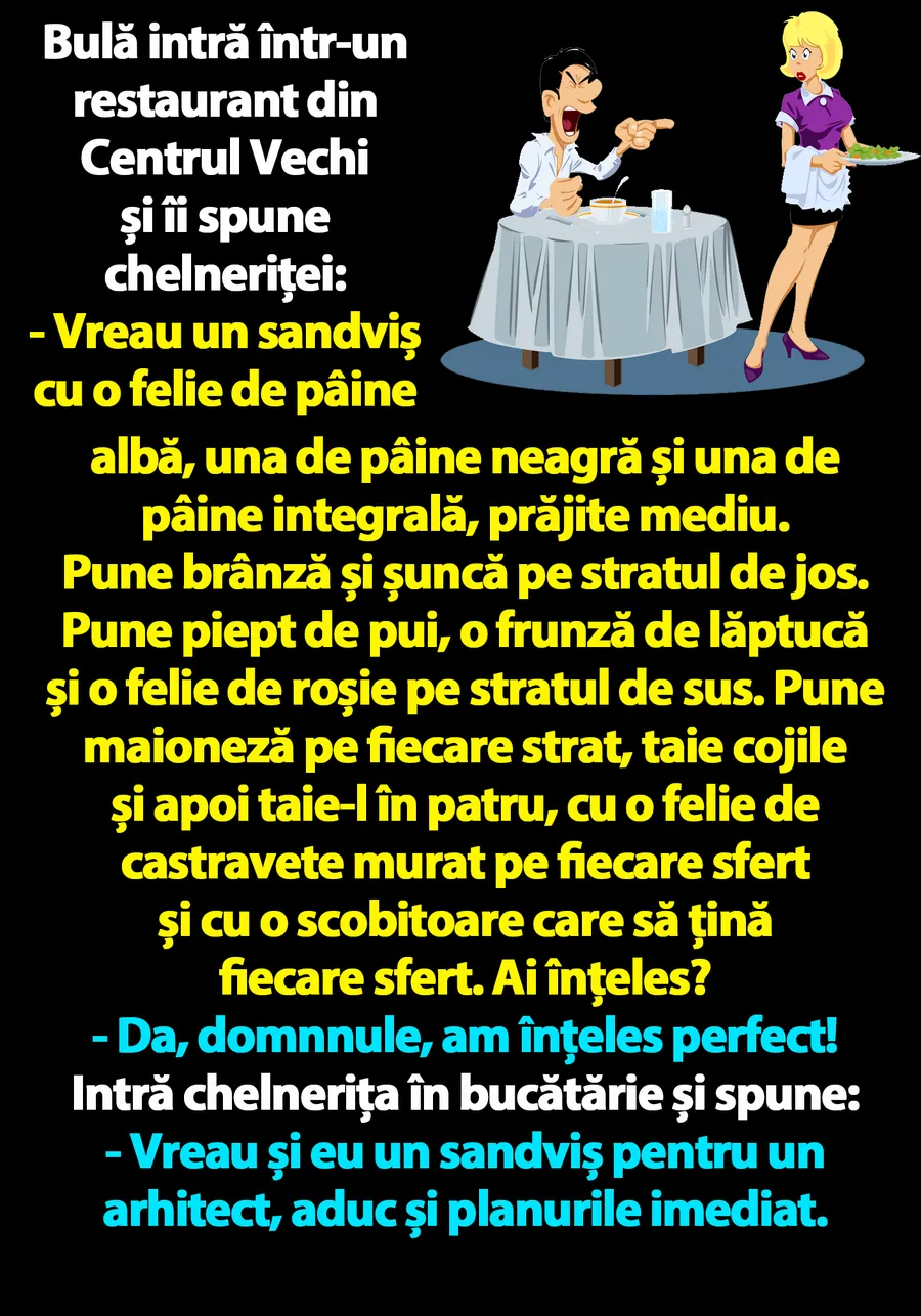 – Vreau și eu un sandviș pentru un arhitect, aduc și planurile imediat.