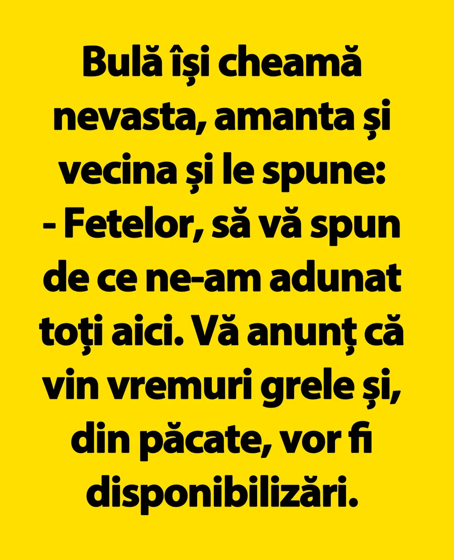 Ziua bună se cunoaște de dimineața! CANCAN.ro vă aduce un nou banc amuzant, care promite să vă dea un start plin de voie bună acestei zile de weekend. Azi, protagonistul este celebrul Bulă, care are dificultăți în viață. Anunțul făcut soției, amantei și vecinei sigur te va face să râzi!
