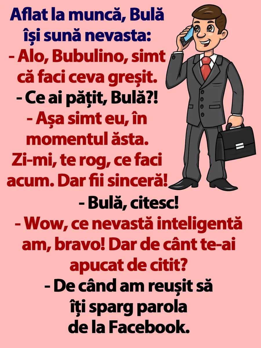 CANCAN.RO pune la dispoziția cititorilor săi un banc amuzant. Alege să începi weekend-ul cu o doză de umor. Dialogul dintre Bulă și soția sa te va face să râzi cu gura până la urechi.