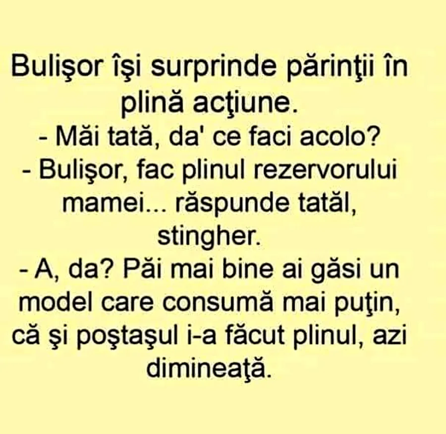 Ziua bună se cunoaște încă de dimineață și trebuie începută cu zâmbetul pe buze. Iar pentru asta am pregătit un banc care cu siguranță te va amuza copios. Protagonistul de astăzi este Bulă JR. Acesta își surprinde părinții în acțiune și are câteva întrebări interesante. Deznodământul este hilar.