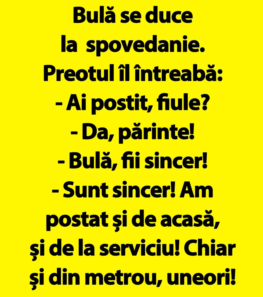 Dragă cititorule, pentru astăzi, CANCAN.RO ți-a pregătit un banc de nota 10. Bulă se duce la spovedanie și este întrebat de către preot dacă a ținut post. Vezi în ce situație întortocheată ajunge, de această dată, cel mai iubit personaj al glumelor românești.