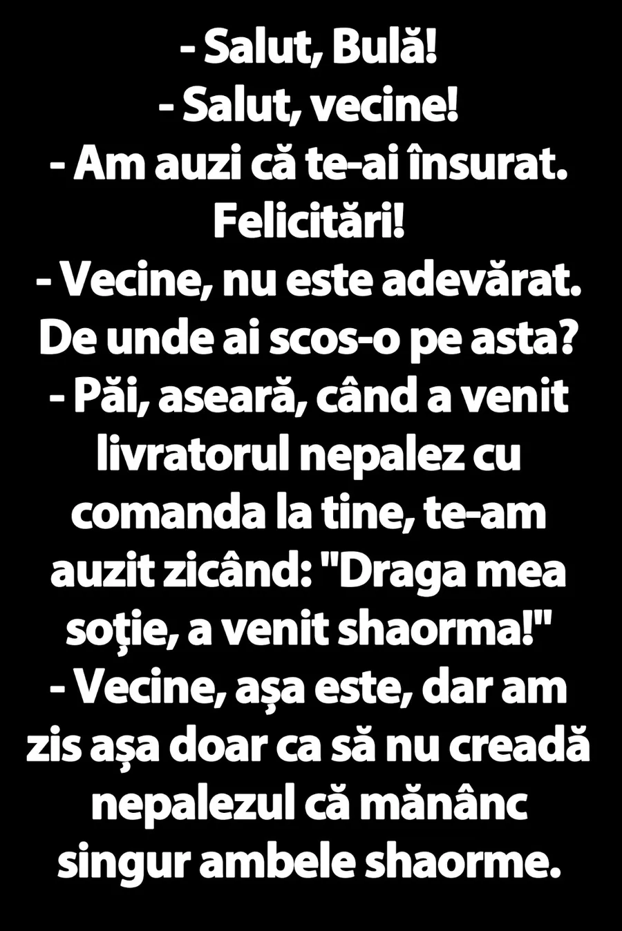 – Vecine, așa este, dar am zis așa doar ca să nu creadă nepalezul că mănânc singur ambele shaorme.