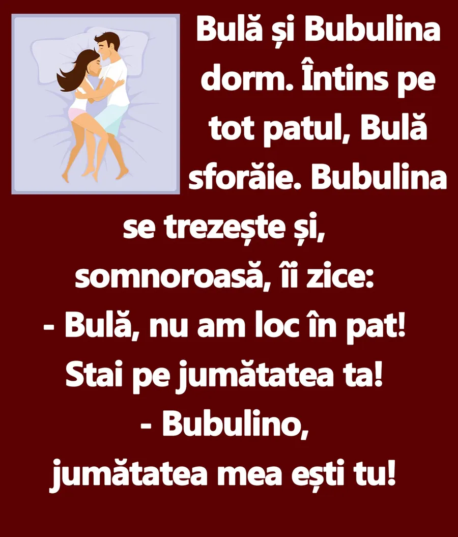 Banc. Este luni dimineață și este momentul să începeți ziua cu zâmbetul pe buze. Acum, vă aducem în atenție bancuri savuroase cu Bulă și Bubulina. Cei doi dorm în pat, iar Bubulina îi spune lui Bulă că nu mai are loc de el. Reacția lui stârnește pe de-o parte amuzamentul și, pe de altă parte, emoția.